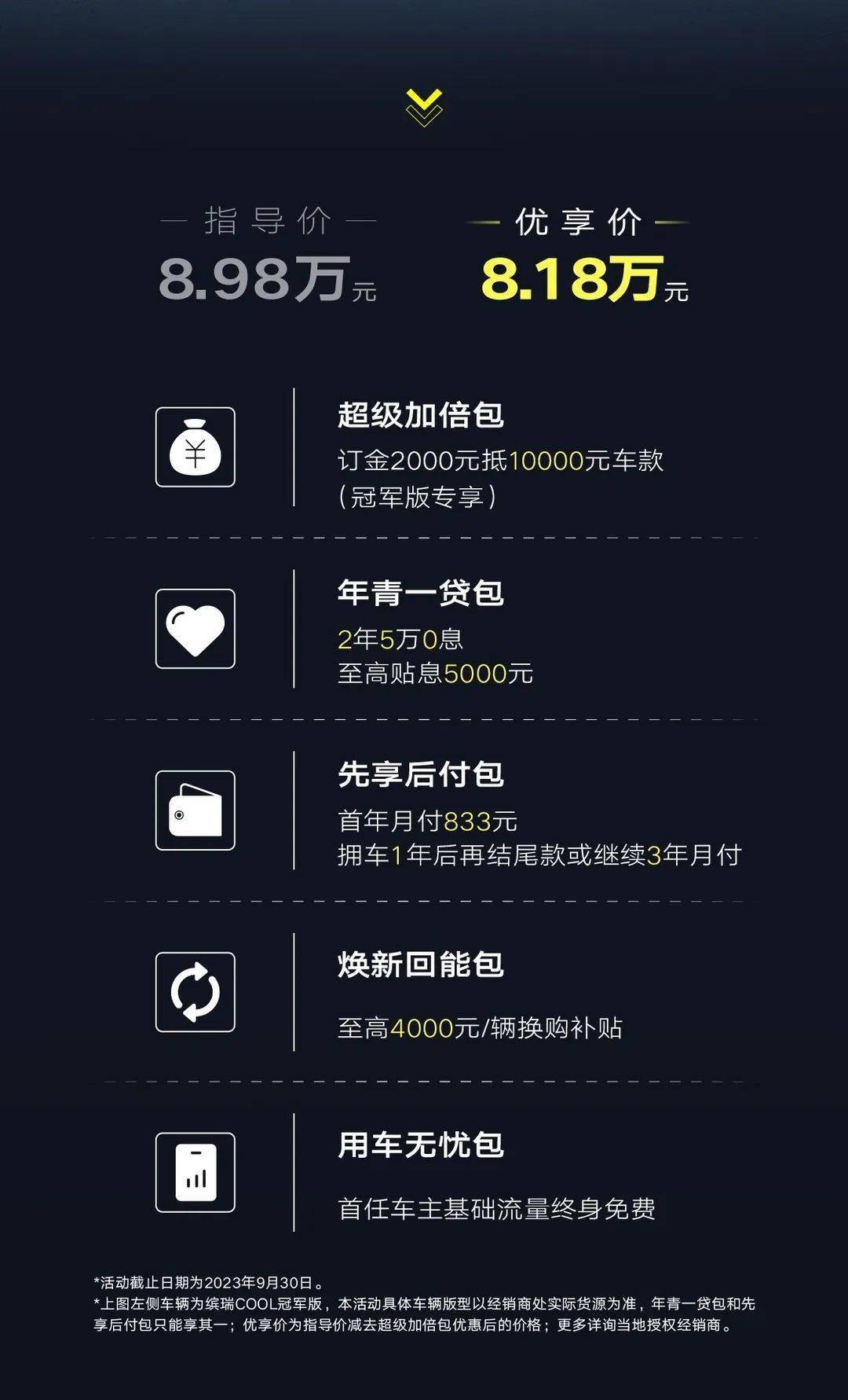 8 月 28 日讯:吉利缤瑞 COOL 冠军版车型正式上市,指导价 8.98 万元,限时 8.18 万元,截至 9 月 30 日。