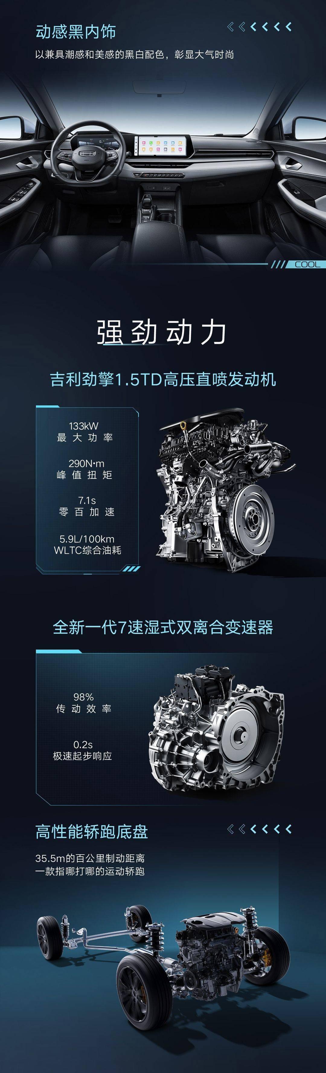 动力方面,新车搭载 1.5TD 高压直喷发动机 + 全新一代 7 速湿式双离合变速器,最大功率 133kW,峰值扭矩 290N・m,零百加速 7.1s,WLTC 综合油耗 5.9L / 100km。